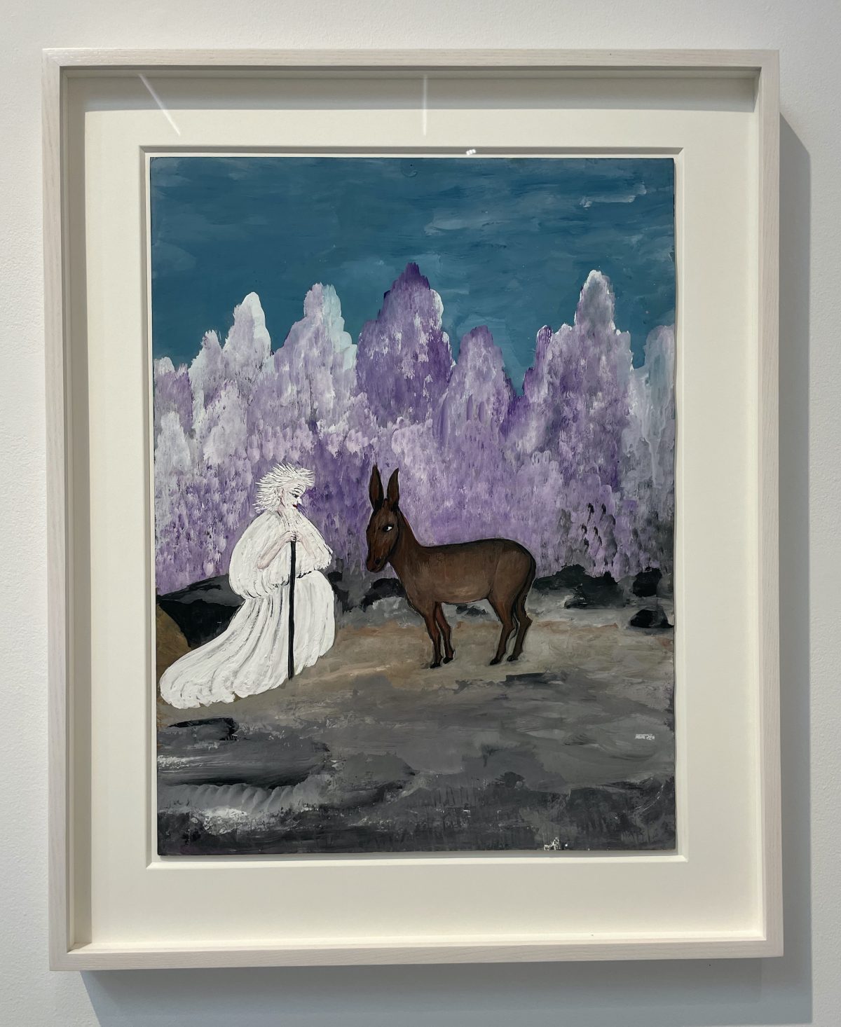 Spore Bush herself described her art as prophetic and guided by the spiritual forces she called “They” or “the People.” Edward Alden Jewell’s 1943 New York Times review, for instance, quotes her as saying: “They move my hand up and down and onward across and sideways in all directions.” Though this automatic process might echo that of af Klint, Peavy, and others, defaulting to such comparisons defangs the art and erases its cultural context. A more substantive comparison is the oversized vultures that recur in Goya’s Disasters of War print cycle (1810–20), in works like “The Carnivorous Vulture” and “The Consequences.” Likewise, her early allegorical painting series, in which a bearded figure in an amethyst cloak communes with animals, reminded me of art books by Oskar Kokoschka and Ernst Ludwig Kirchner, in which loose, colorful drawings convey Christian or spiritual narratives.
