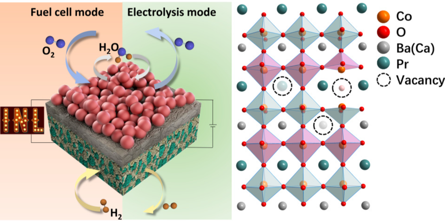 PCFC/PCECs are essentially the same device, just operating in opposite directions. In the fuel cell (PCFC) mode, the device consumes hydrogen in the anode and takes oxygen from air in the cathode to form water and generate electricity. In the electrolysis cell (PCEC) mode, the device converts water and electricity into hydrogen and oxygen.