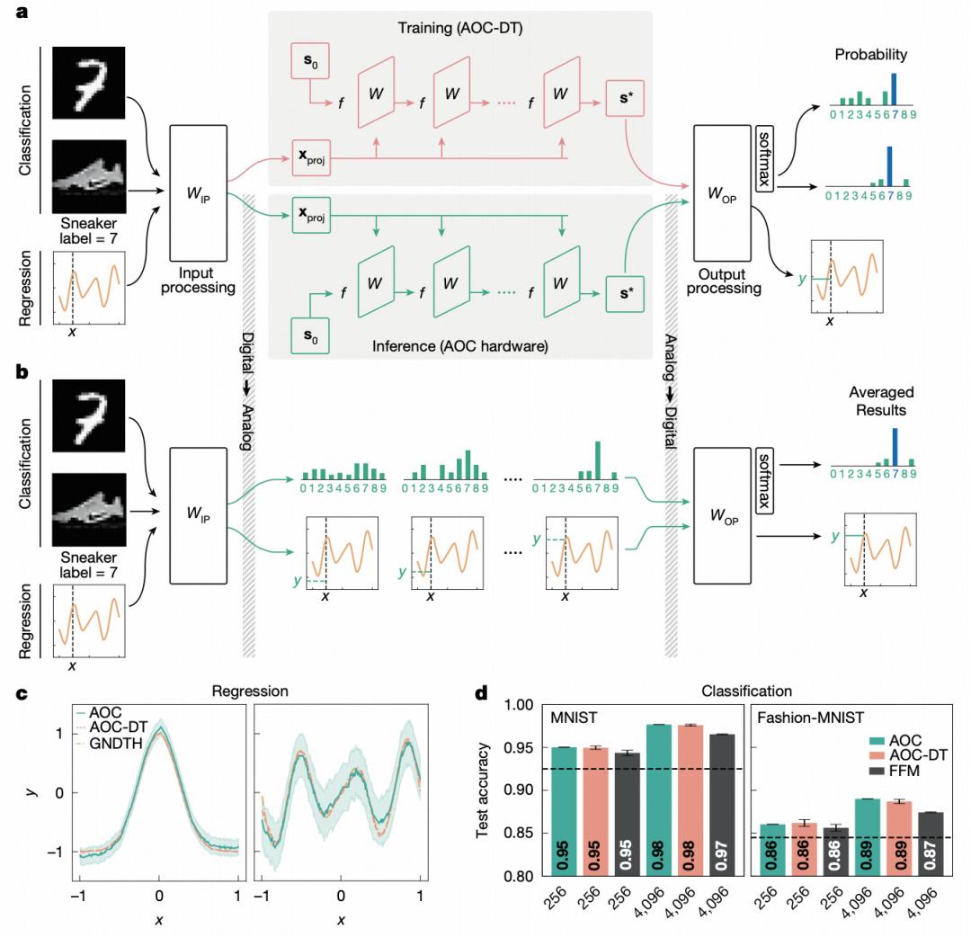 The AOC hardware combines 3D optical technology with analog electronic technology and implements two machine – learning inference tasks based on a balanced model: image classification and nonlinear regression. In these two tasks, the models are digitally trained through AOC – DT and directly deployed on the hardware without further calibration. This places high requirements on hardware accuracy and also requires AOC – DT to have high fidelity.