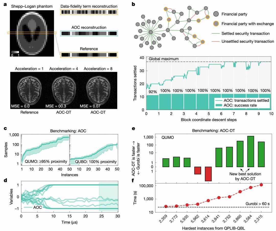 In the financial optimization task, they used the AOC hardware to solve a transaction settlement problem. Each securities transaction is an exchange of payment for securities. Clearinghouses process batches of such transactions. In each transaction batch, the goal of transaction settlement is to maximize the total number or total value of settled transactions. Given the large number of transactions and the constraints of laws and other additional requirements, this becomes a complex optimization problem. In this transaction settlement scenario, the AOC hardware found the global optimal solution within 7 block coordinate descent (BCD) steps. In contrast, the success rate of quantum hardware on the same problem is only 40 – 60%.