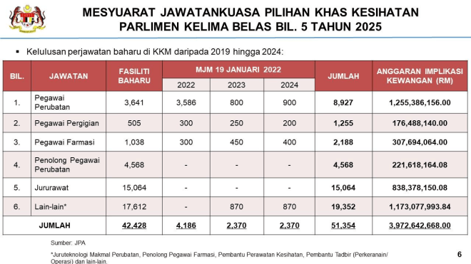 The number of new positions approved in the Ministry of Health (MOH), together with estimated financial implications, from 2019 to 2024. Graphic by the Public Service Department (JPA), presented at a Health parliament special select committee (PSSC) hearing on February 27, 2025, and reported in the Health PSSC’s report titled “Proposal to Form a Health Service Commission” that was tabled in the Dewan Rakyat on August 27, 2025.
