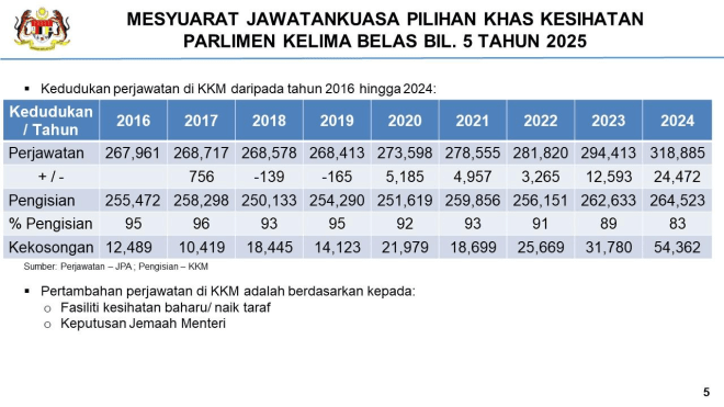 JPA further presented data that showed a declining rate of filled vacancies in the MOH from 95 per cent in 2016 to 83 per cent in 2024. Last year, as of December 31, 2024, the Health Ministry had 54,362 vacancies, including five in the Malaysian Medical Council and the Medical Device Authority.