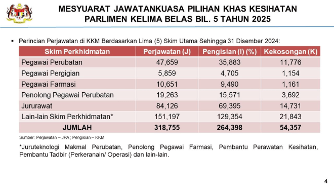 The number of filled positions and vacancies in five main service schemes in the Ministry of Health (MOH) as of December 31, 2024. Graphic by the Public Service Department (JPA), presented at a Health parliament special select committee (PSSC) hearing on February 27, 2025, and reported in the Health PSSC’s report titled “Proposal to Form a Health Service Commission” that was tabled in the Dewan Rakyat on August 27, 2025.