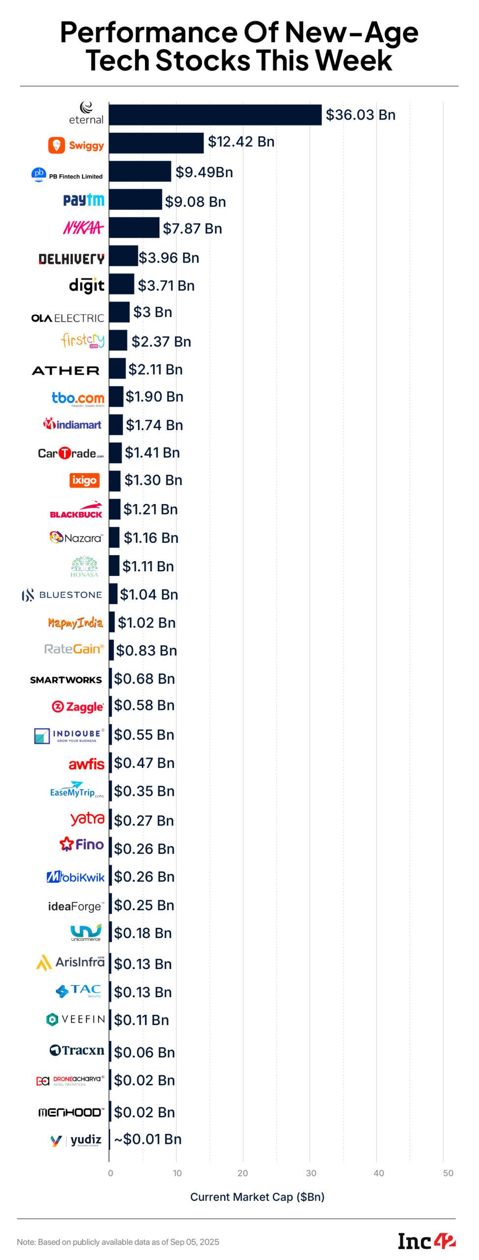 While BlueStone, Ather Energy, ixigo, Smartworks, Eternal, IndiQube, Yatra touched fresh all-time highs during the week, Delhivery, Paytm, Nykaa and CarTrade soared to new 52-week highs.