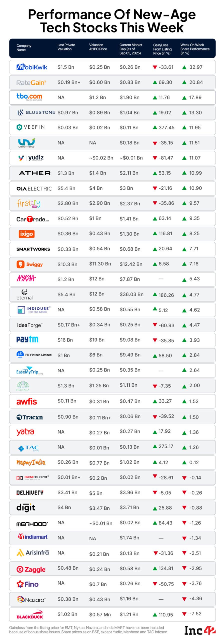 Overall, 27 new-age tech stocks gained this week, rising 0.12% to about 33%. Coming fresh off an all-time low on August 29, fintech company MobiKwik emerged as the biggest gainer. Its shares zoomed 32.97% to end the week at INR 293.60.