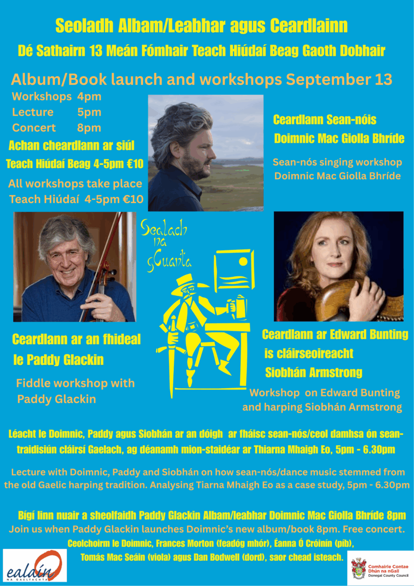 At 4pm Paddy Glackin will give a fiddle workshop, Siobhán Armstrong will give a harping workshop and Doimnic Mac Giolla Bhríde will give a sean-nós singing workshop.