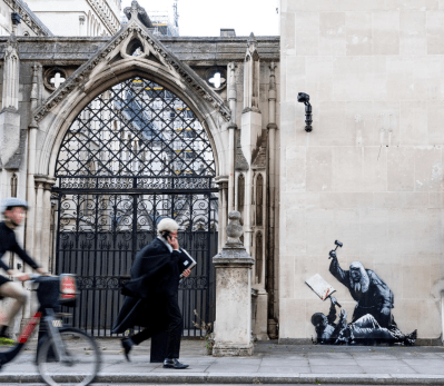 A new mural by the famous street artist Banksy at the Royal Court of Justice, showing a judge using a gavel to beat a protestor, was soon covered up and guarded by security.