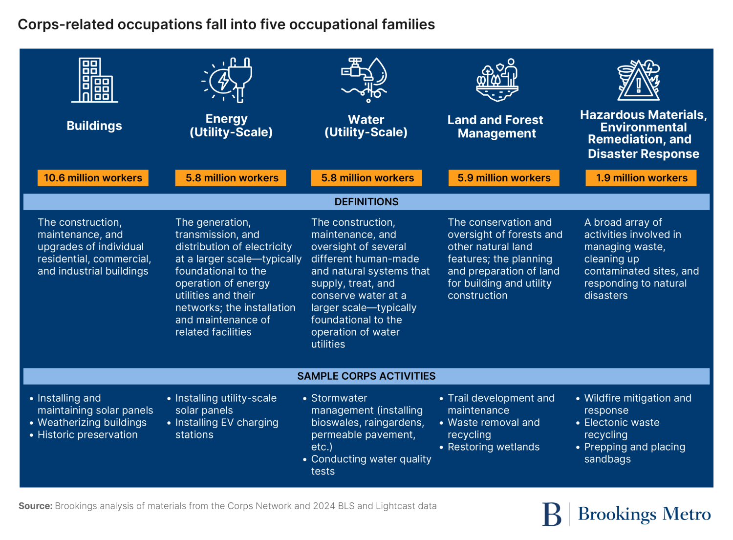 • As a starting point, we created a broad list building off previous Brookings research on infrastructure occupations that closely align with several corps-related activities.