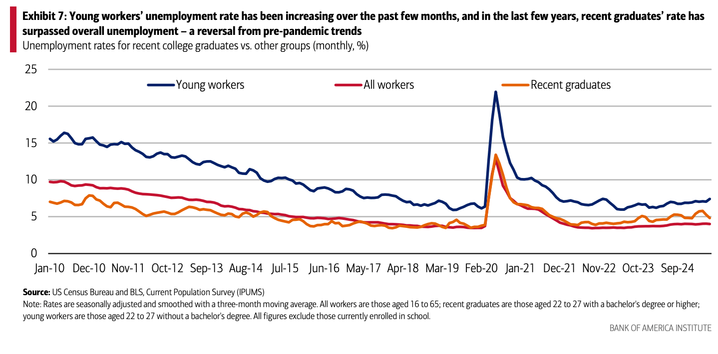 The report says it’s uncovered “substantial” declines in employment, especially for workers ages 22 to 25. This dovetails with mounting evidence from investment banks and surveys of layoff announcements, as Goldman Sachs has calculated a shrinking premium from a college degree, implying that entry-level workers are struggling to differentiate themselves in this hiring climate. Bank of America Global Research, meanwhile, has noted that since 2022, the unemployment rate for recent graduates has started to exceed the overall unemployment rate for the first time in recent memory.