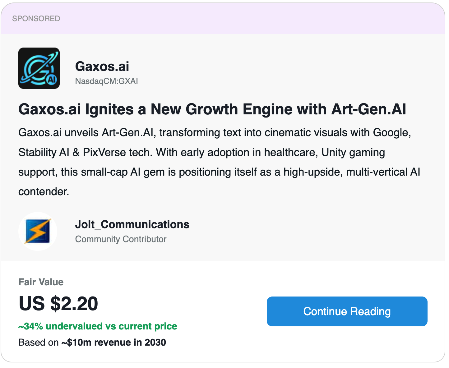 Jolt_Communications is an investor relations firm working with Gaxos.ai. Simply Wall St has no position in any of the companies mentioned. These narratives are general in nature and explore scenarios and estimates created by the authors. These narratives do not reflect the opinions of Simply Wall St, and the views expressed are the opinion of the author alone, acting on their own behalf. These scenarios are not indicative of the companyâs future performance and are exploratory in the ideas they cover. The fair value estimateâs are estimations only, and do not constitute a recommendation to buy or sell any stock, and they do not take account of your objectives, or your financial situation. Note that the authorâs analysis may not factor in the latest price-sensitive company announcements or qualitative material.