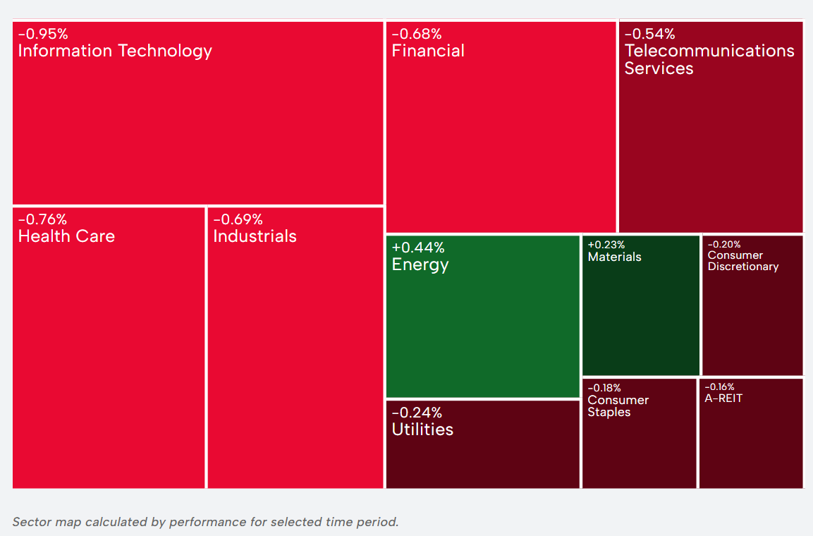 Tech, health, industrials and banks were the biggest losers in early trade. Energy and miners were in the green.