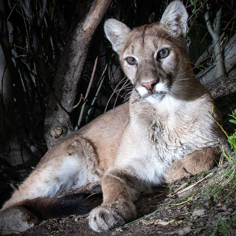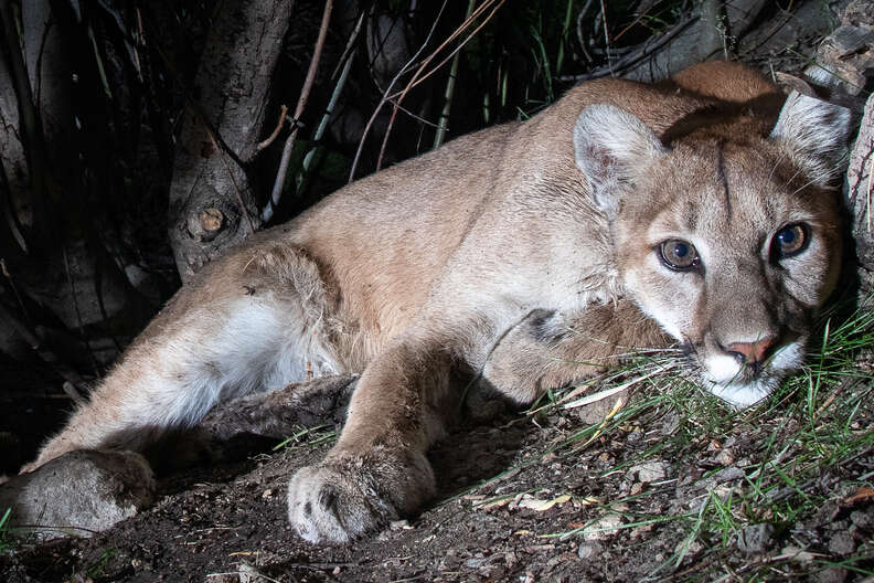 The photos, captured at night, show a tan mountain lion resting her chin on some grass. The cat’s big, brown eyes stare directly into the lens, as though she meant to pose for some glamour shots.
