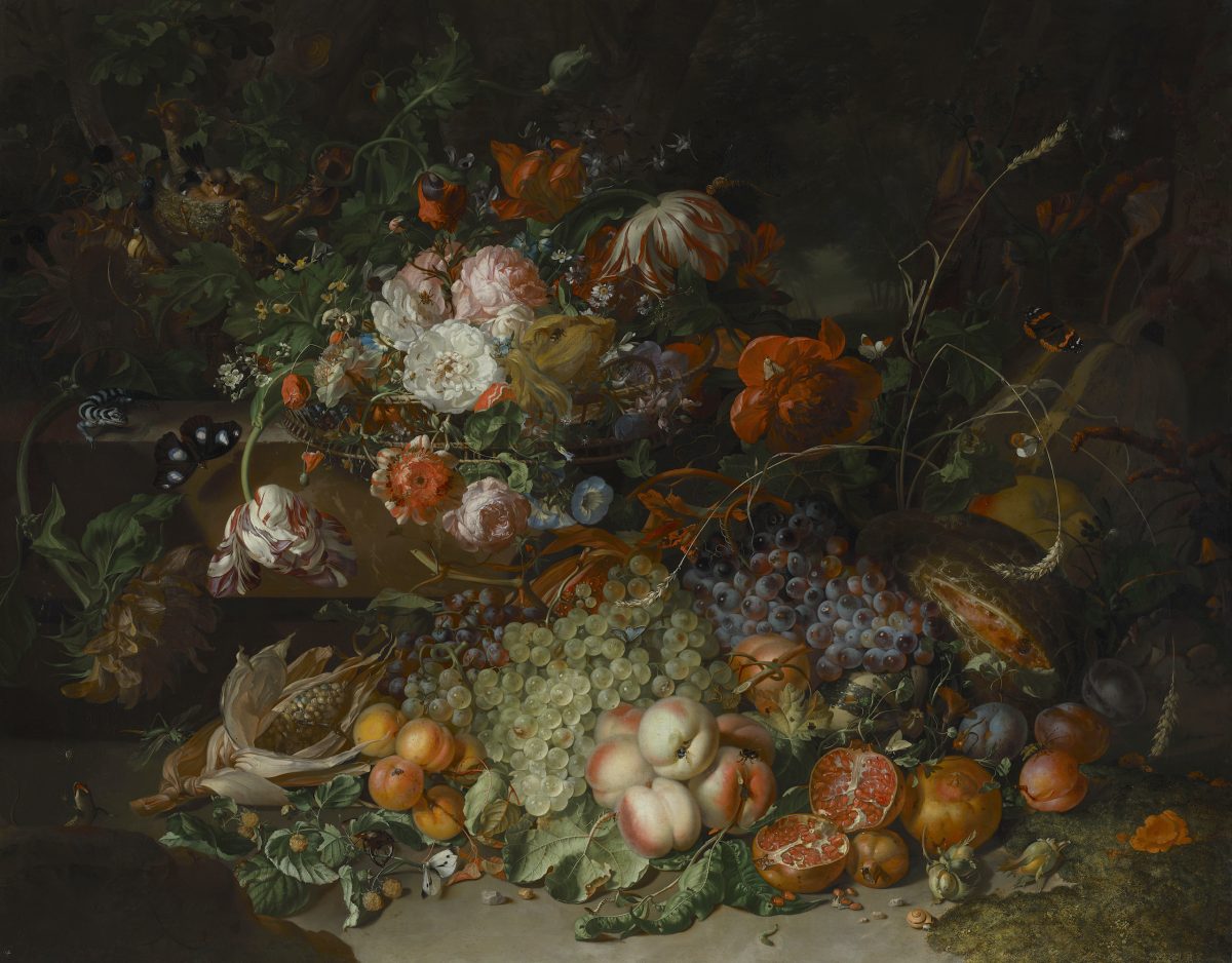 Rachel Ruysch, “Still Life with Fruits and Flowers (1714), oil on canvas; Kunstsammlungen und Museen Augsburg, Karl and Magdalene Haberstock Stiftung (© Kunstsammlungen und Museen Augsburg, photo Bayerische Staatsgemäldesammlungen, Nicole Wilhelms. Image courtesy Museum of Fine Arts, Boston)