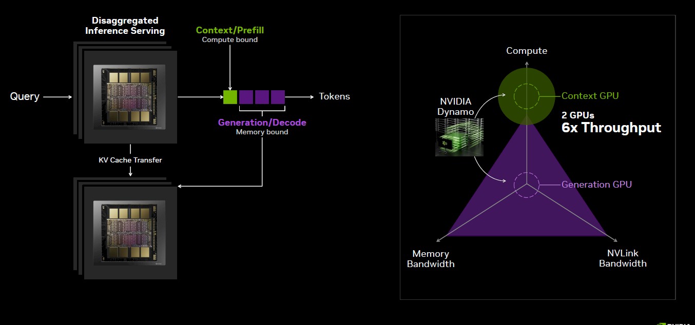 But, you can disaggregate the context processing from the generation, and in this scenario you have a Rubin GPU CPX chewing on the context and a Rubin GPU doing the generation of tokens, with a KV cache linked the two and even allowing you to store KV functions to speed up token generation because you are not reprocessing the whole token context with each token that is generated. So, says Nvidia, you can use two GPUs and get 6X the throughput for long context AI inference.