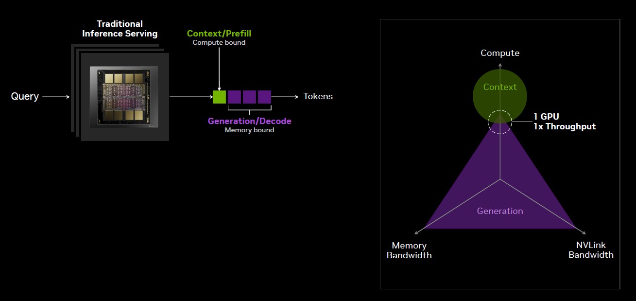 Here is the deal. If you try to do long context processing on a single GPU that has a lot of compute as well as memory bandwidth and capacity, you won’t have the right balance for each part of the context processing (called prefill) and the generation (called decode) parts of the inference. The memory bound generation operation can only proceed once the compute bound context processing is done. Like this: