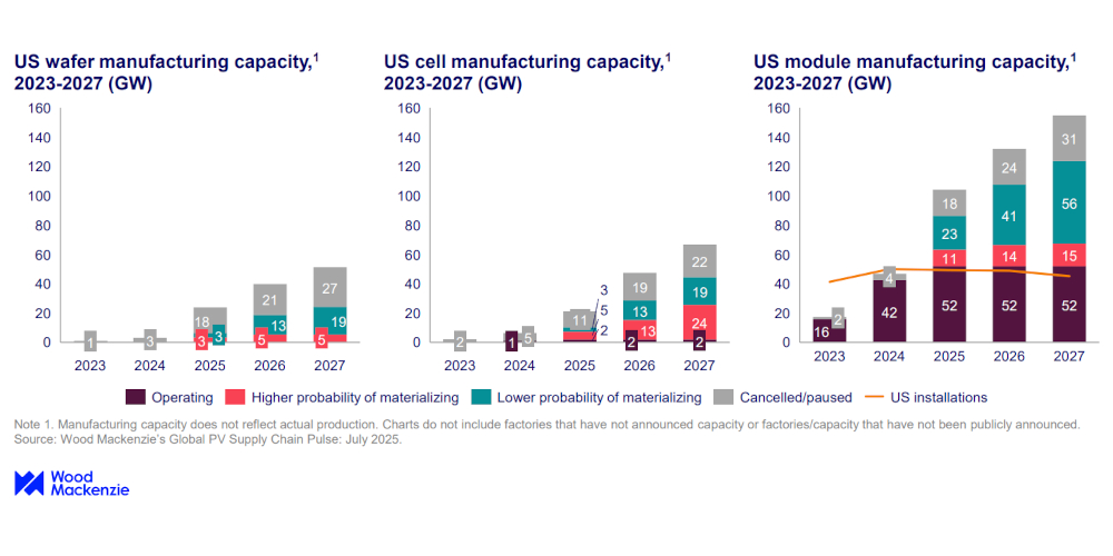 There is more than enough domestic solar panel capacity to supply the market, but access to upstream components is still lacking. With over 55 GW of solar panel assembly currently sited in the United States, and less than 50 GW expected to be installed each year through 2030, a supply of American-assembled solar panels with foreign components could theoretically meet the country’s demand. As projects have found more unique ways to calculate domestic content percentages using balance-of-system components, less weight is being placed on silicon wafers and cells being made in America. But it leads to an interesting question, posed by WoodMac’s Martinez: Facing an oversupply situation, can the United States become a solar panel exporting country?