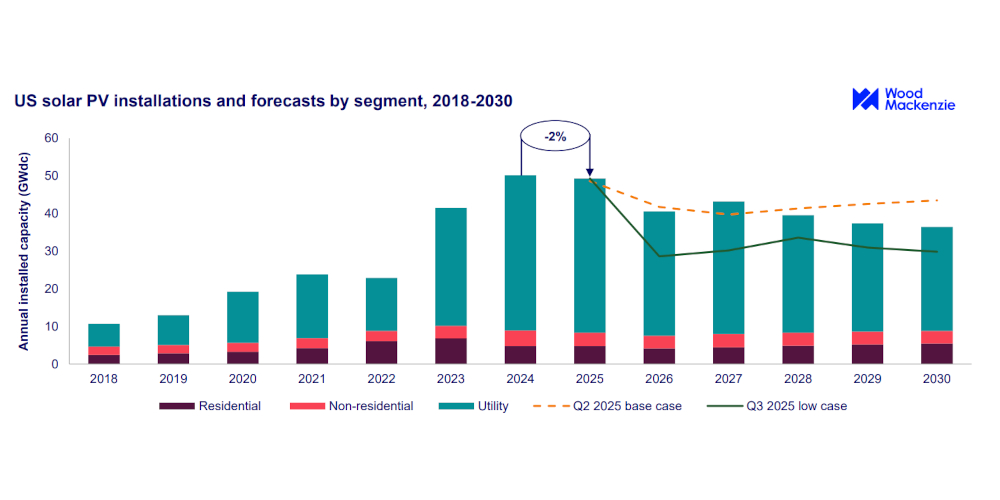 Most utility-scale solar projects come online in Q4, but WoodMac is already seeing a 24% decrease in installs so far this year. Once the year ends, the group expects to see a 2% decrease in installed capacity. While solar projects will still get built, especially as the country requires more quick-sited electricity to meet data center demand, the next few years will feel a dip. Around 246 GW of new solar is expected through 2030 — a 21% decline over what was predicted before HR1 hit the industry.