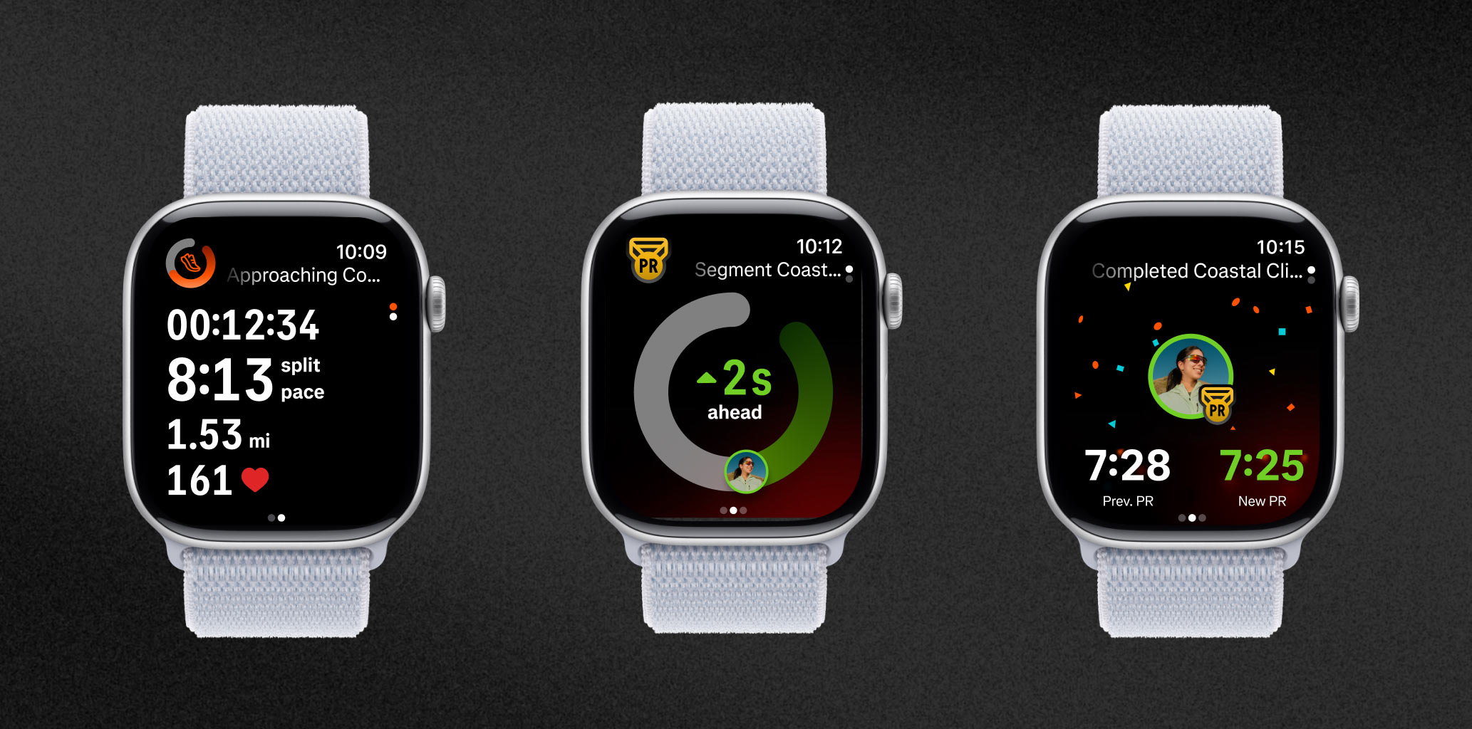 As for Live Segments, as you approach a segment, a banner with the segment name and a circle indicator appear on the watch face. The circle updates in real time to reflect progress, and show whether you’re ahead or behind your personal record. At the end of the segment, your results are displayed before the app returns to its main screen.