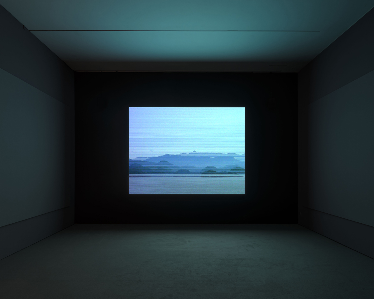 If Douglas’s recasting of photography relies on composite strategies (collage, layering, suturing), his film and video work often involves splitting (Hors-Champs, 1992), doubling (Der Sandmann, 1995), and looping (Luanda-Kinshasa, 2013). Nu•tka• (1996) shows present-day Vancouver Island, the unceded territory of the Mowachaht-Muchalaht First Nations. The single image is split into two separate feeds that display at different rates, so that the screen vibrates and pixelates, becoming more or less unreadable. The soundtrack, meanwhile, is doubled: two narrators—one purporting to be the Spanish explorer José Estéban Martinez, the other the English naval captain James Colnett—speak over and at odds with one another, which makes sense, given they were colonizers fighting over land that was not theirs. The film is accompanied by a suite of photos of the island, each of which points out in subtle ways that it was never a terra nullius.