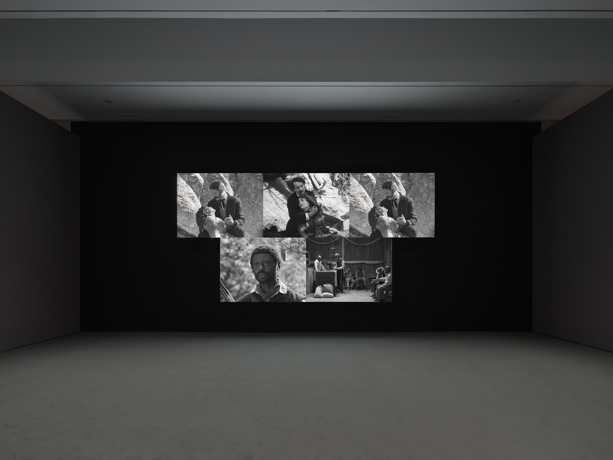 And then there’s Birth of a Nation (2025), shown here for the first time. It focuses on the infamous “Gus chase” from D. W. Griffith’s 1915 film, in which Gus, a Black freedman and army captain (played by a white actor in blackface), proposes marriage to Flora, a white woman, who, in her horror at being so besmirched, flings herself off a cliff. Flora’s brother Ben, a Klansman, chases Gus down and, with his racist coconspirators, lynches him. One of the five channels of Douglas’s installation shows Griffith’s original sequence; on either side and below are four other projections, breathtaking in their apparent visual fidelity to the original, although departing at crucial points from its narrative. Douglas pries apart Griffith’s film, dedicating a channel to Flora, her brother, and—because Gus’s point of view is never accounted for by Griffith—two new characters, Sam and Tom. The demeanors of the latter make clear that “Gus” was only ever a projection of Flora and Ben’s white, racist imaginations. (Sam is shown walking through the forest, minding his own business, for pretty much the whole thirteen-minute sequence.) Griffith used realist filmmaking techniques—innovative editing, relatively unaffected acting styles, and shooting outdoors—to naturalize his anti-Black propaganda. Douglas aims for the opposite, an unraveling of the ways in which filmmaking serves ideology by papering over the psychic miasma lurking beneath its seamless appearance. By the time we reach the end—when, suddenly, one screen switches from black-and-white to color, and we see Tom’s body hanging not from a tree but from a crane in a blue-screen studio, with cast and crew gathered around—photography’s evidentiary claim is revealed for what it is: a construction, a fiction, a trap.