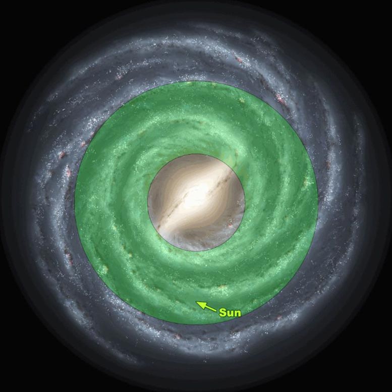 Longstanding model of the Galactic habitable Zone, which is estimated to exist between 7-9 kiloparsecs from the center of the galaxy. However, recent research calls this into question. Credit: NASA/Caltech
