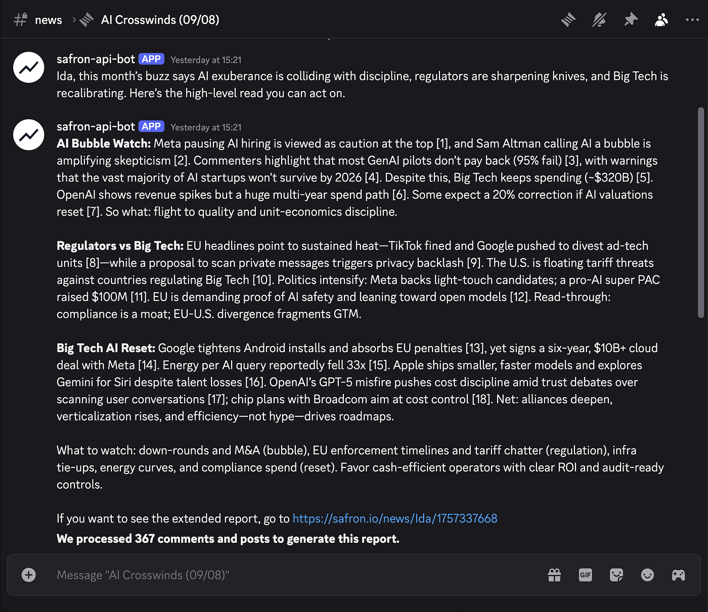 This endpoint receives a keyword and a time period, and the system sorts comments and posts by engagement. Then it process the texts in chunks with smaller models that can decide which “facts” to keep.