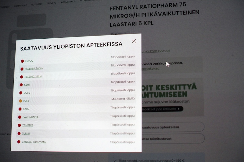 Availability status of Fentanyl Ratiopharm extended-release patches, as shown on the University Pharmacy’s website. Photo: Teemu Salonen / Lehtikuva