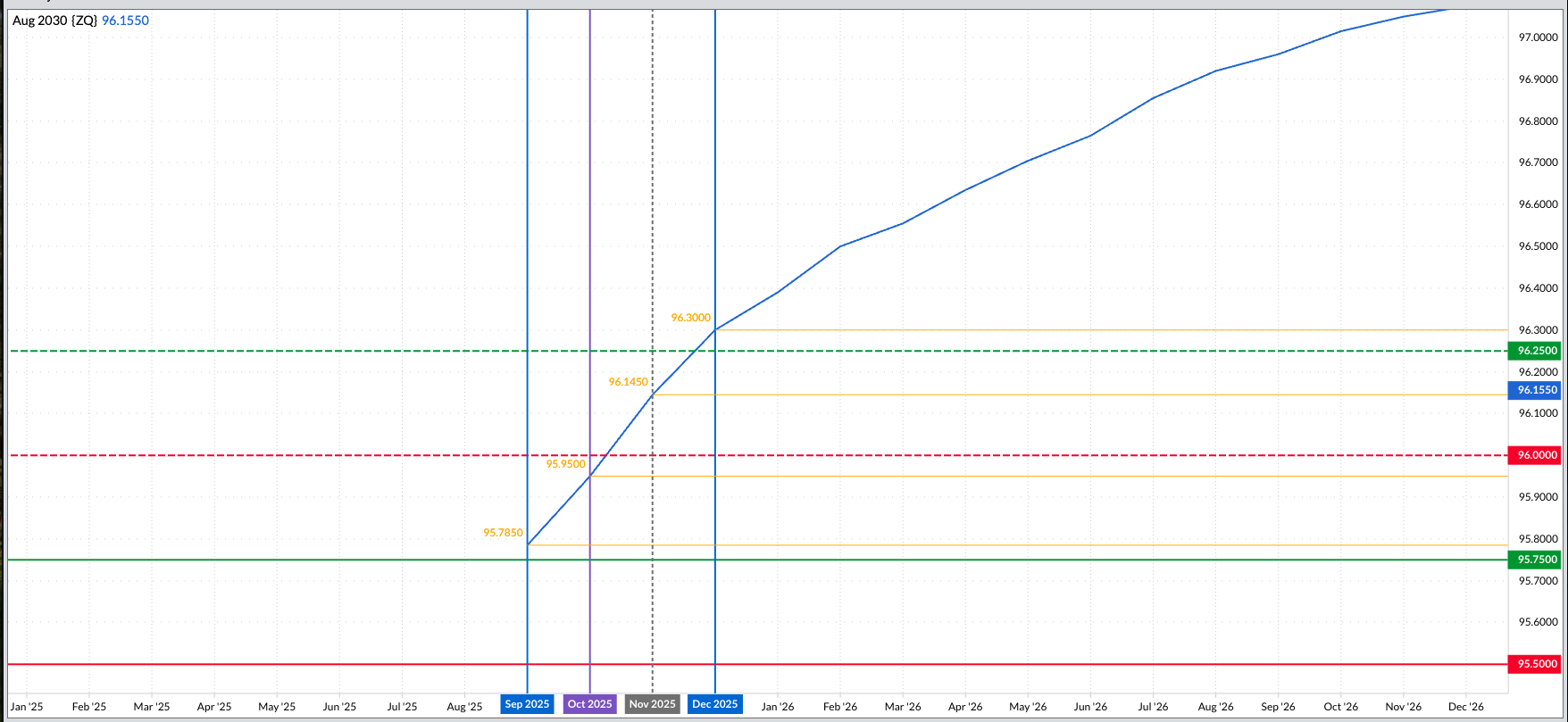 A 50-basis point rate cut: Talk of this has grown louder from the president’s most ardent supporters over the past couple weeks. But then again, this group can’t be taken too seriously because, well, you know. Based on what we see in the Fed fund futures forward curve, a 50-basis point rate cut doesn’t seem likely this week. At last Friday’s close, the September 30-day fed funds futures contract (ZQU25) was priced at 95.785, implying a rate of 4.215%, below the low end of the current range at 4.25%. Meanwhile, the October contract (ZQV25) closed at 95.95 putting the implied rate at 4.05% with the next FOMC meeting scheduled for October 28 and 29. However, the November contract (ZQX25) closed at 96.145 (3.855%) with December (ZQZ25) at 96.3 (3.7%) and the last meeting of 2025 scheduled for December 9 and 10.