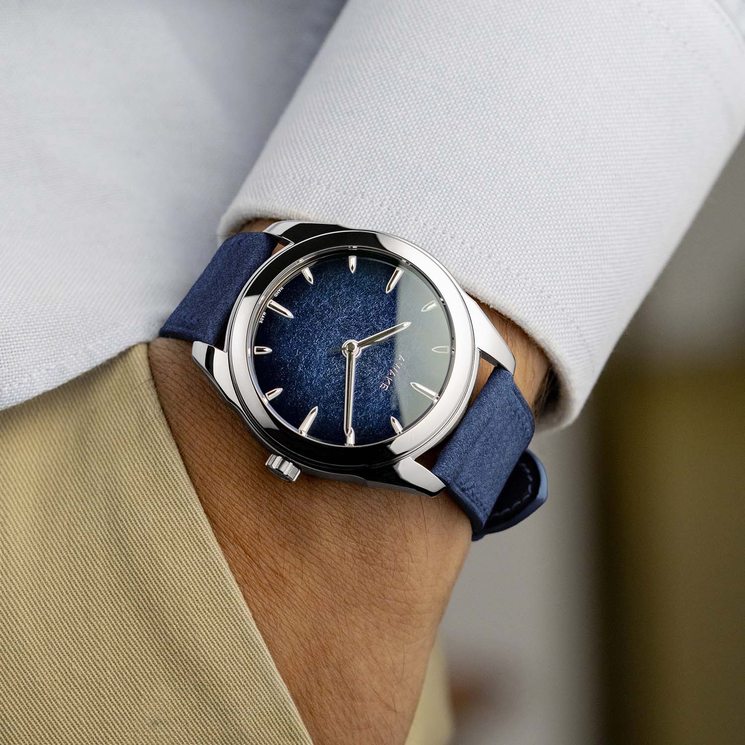 On a first layer of dried lacquer, sanded and polished, the pure silver leaves are delicately applied with a brush. Once the silver leaf is applied, natural pigments are sprayed onto the dial to give it its colour and contrasts. Then a dozen successive layers of lacquer are applied and polished one by one. The inaugural collection of 2024 incorporated vibrant colours – Lava, Emerald, Outre Bleu and Amethyst. For 2025, the brand brings 4 new colours to form the permanent collection (and a fifth one as a limited edition) and adds to the equation a trendy gradient “vignette” effect to striking tones: Ultra Violet, Palladium, Carmine Red and Moonlight Blue. In addition, a 100-piece Golden Hour with warm red, orange, and yellow hues completes the quintet.