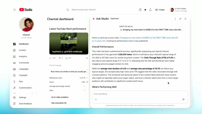 Another new tool, Ask Studio, provides an AI-powered chatbot assistant that can guide users and answer questions about their account, like how their latest video is performing or what their audience is saying about their editing style, for example. The tool is meant to offer creators actionable insights that will help them grow their channel, according to YouTube.