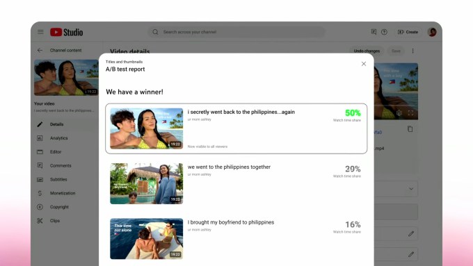 YouTube Studio will also introduce a way to test and compare up to three different video titles and thumbnails, as an update to its A/B testing feature launched to select creators in 2023 and expanded the following year. Creators have used this testing feature more than 15 million times so far, according to the company (a metric that seems a bit small, given that 20 million videos are uploaded to the site daily).