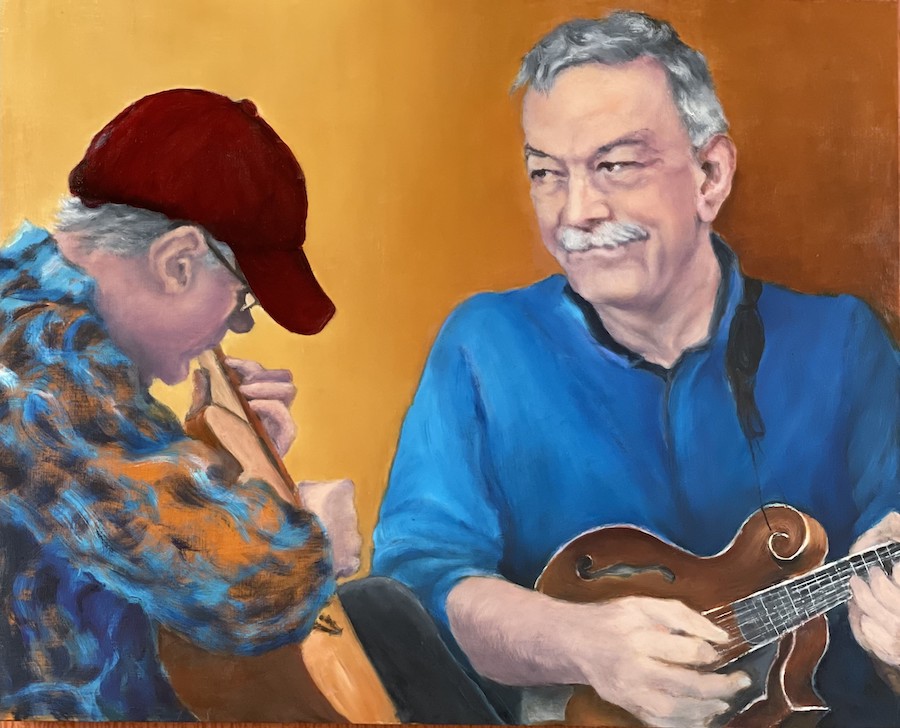 Mary, who cared for Dermot at home until he entered full-time care two and a half years ago, painted him alongside his brother Patsy, both lifelong musicians, playing music together – a bond that has endured through the challenges of dementia.