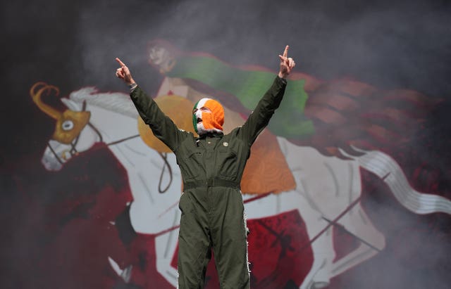 Kneecap’s DJ Provai performing on the main stage on day two of the Electric Picnic festival at Stradbally in Co Laois (Niall Carson/PA)