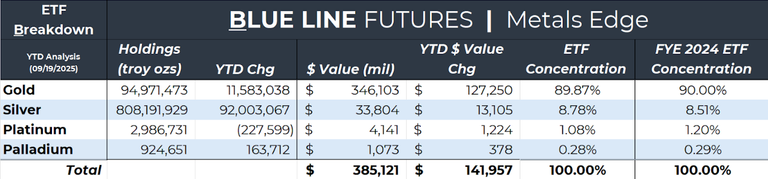 The outside market backdrop continues to show broadening strength, with all four major stock indices reaching record highs for the first time since 2021, which plays a significant role in shaping the sentiment of the precious metals market. This renewed market confidence fuels investor flows into ETFs, where total gold and silver holdings by ETFs have increased by 14% and 13% year to date. Get the Blue Line Futures Precious Metals Chart Pack today by registering here: Get Precious Metals Chart Pack