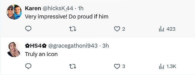 They wrote: ‘That’s fantastic! Proud of you Harry; so impressive!; Truly an icon; That’s fantastic! Proud of you Harry; Amazing!’