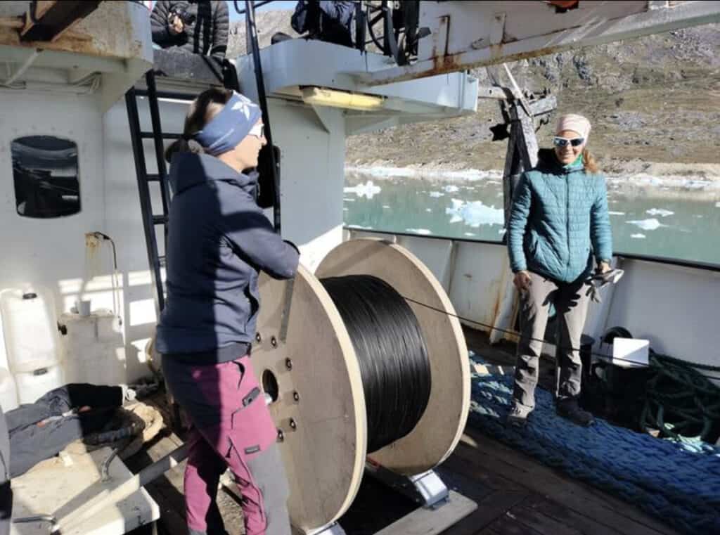 Julia Schmale, an assistant professor at École Polytechnique Fédérale de Lausanne (left), and Manuela Köpfli, a University of Washington graduate student in Earth and space science, unspool fiber-optic cable from a large drum on the R/V Adolf Jensen, deploying it to the fjord bottom to record data. Credit: Dominik Gräff/University of Washington.