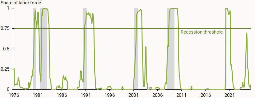In July 2024, nearly 70% of the labor force resided in a state with accelerating unemployment, slightly below the 75% mark typically associated with recession calls, as shown in Figure 2. However, the share of states meeting our LMSI-based rule barely cleared the 30-state threshold and quickly fell within one month, as shown in Figure 1. By contrast, in every post-1980 recession, the LMSI and the share of the labor force in distress quickly climbed and stayed elevated for months. Hence, the more limited geographic pattern of distress and its very short duration were notably different from previous recessions.