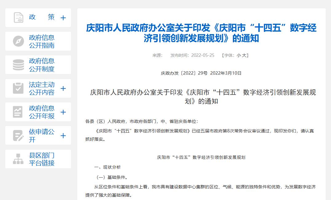 In March 2022, the “Qingyang City’s 14th Five – Year Plan for Digital Economy – led Innovation and Development” was issued, providing important support and specific guidance for Qingyang to build a national hub node for the national integrated computing power network and implement the “Eastern Data Processing with Western Computing” project.