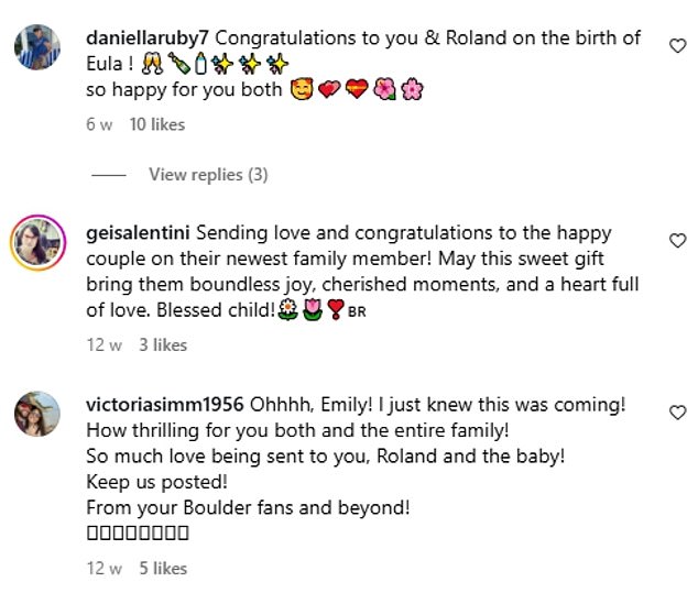A third wrote: ‘Ohhhh, Emily! I just knew this was coming! How thrilling for you both and the entire family! So much love being sent to you, Roland and the baby! Keep us posted!’