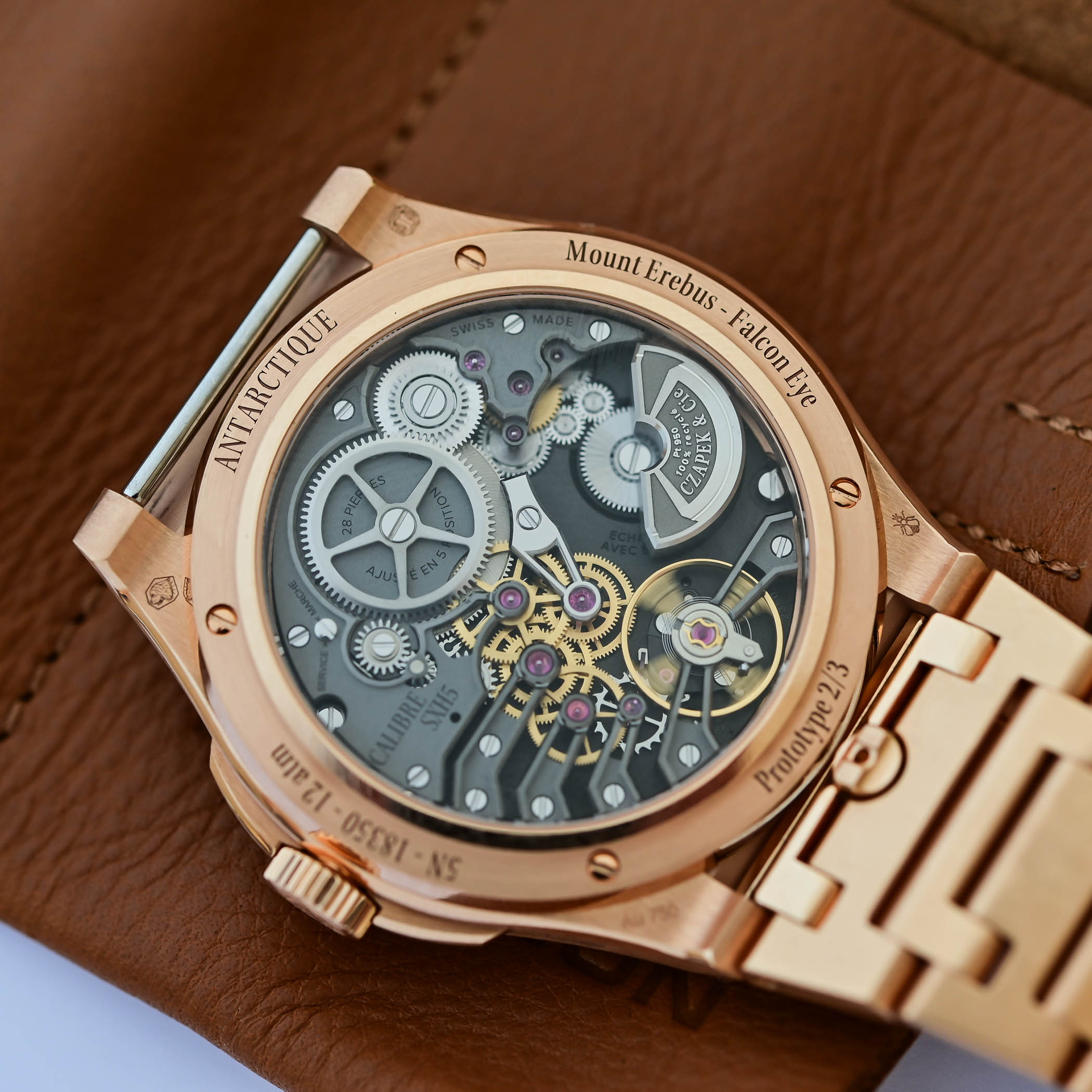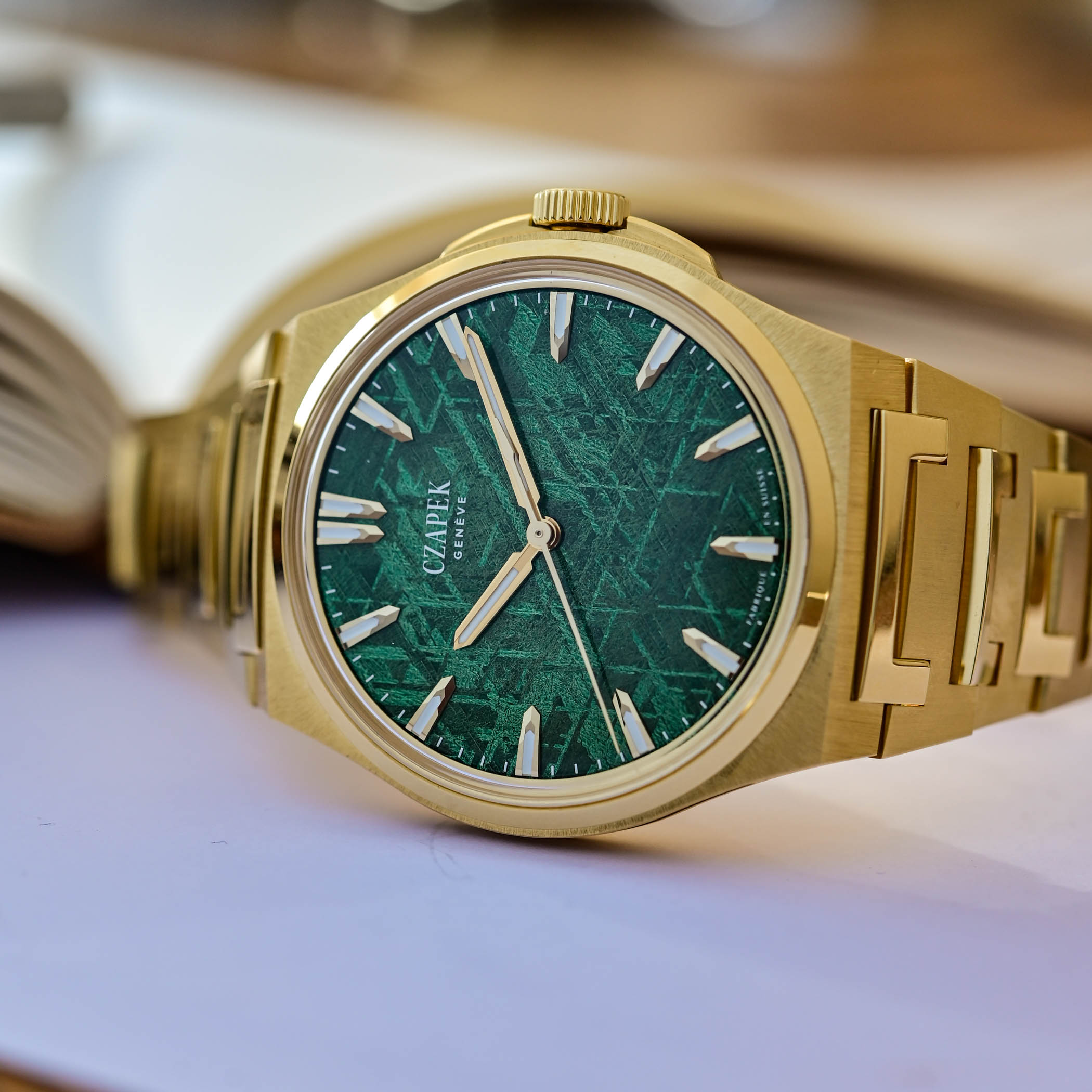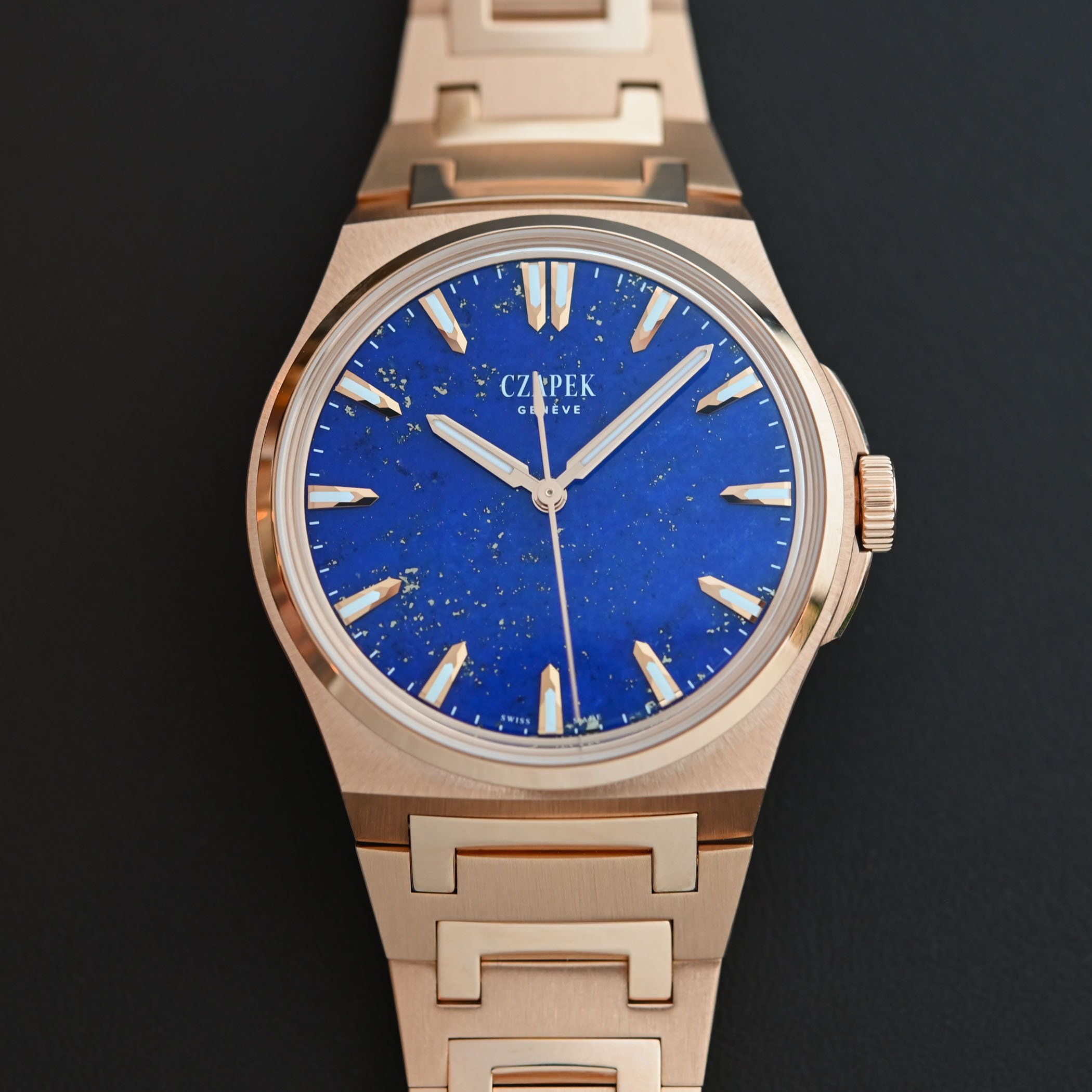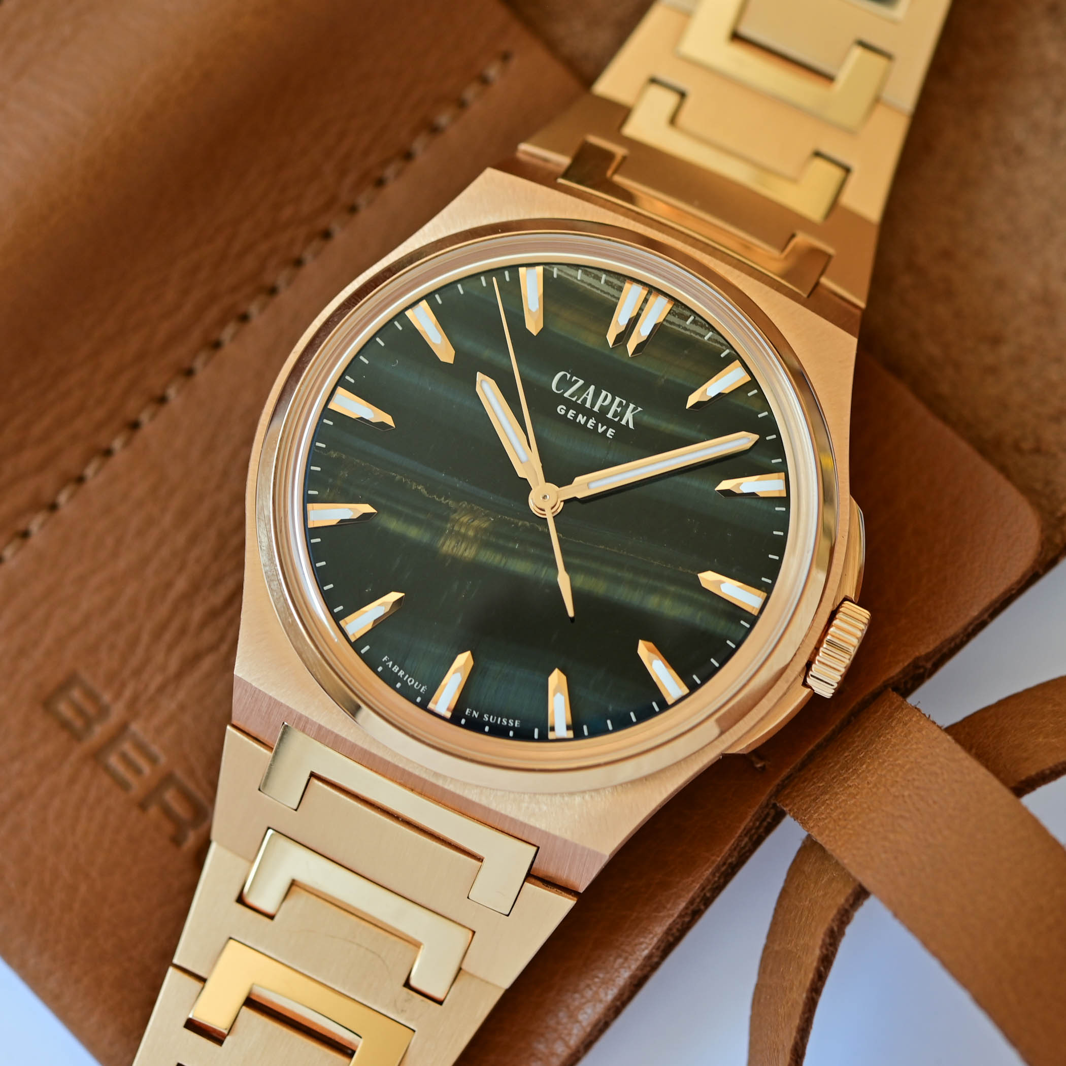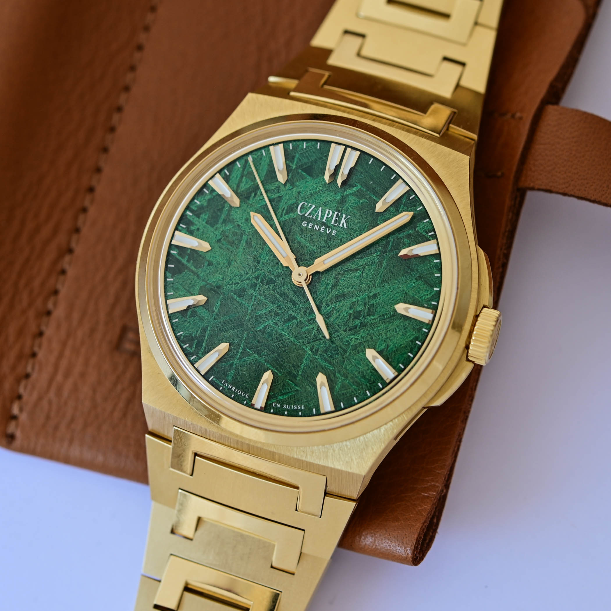 Just five years after its launch, Czapek responded to a request from friends and shareholders for a luxury sports watch. Released in 2020, the elegant Antarctique sports watch, featuring an integrated bracelet and powered by the brand’s first in-house calibre, was a fresh face on the scene. Responding to yet another request from clients, Czapek applied the Midas touch to the Antarctique and dressed it from head to toe in gold with the release of the Mount Erebus in 2024. The name of the watch is taken from Mount Erebus, an active volcano in Antarctica that emits microscopic gold particles in its plume. The latest adventure for the gold Antarctique is the incorporation of natural stone dials.