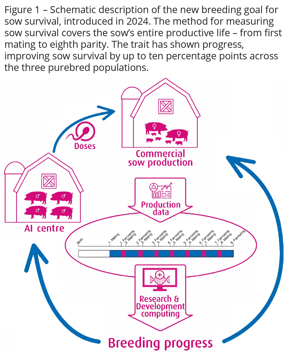 The approach focuses on breeding goal traits that have a direct impact on production results. One example is sow survival, a trait introduced into the breeding goal in 2024. The aim is straightforward: to ensure a long, productive life for each sow in the herd.