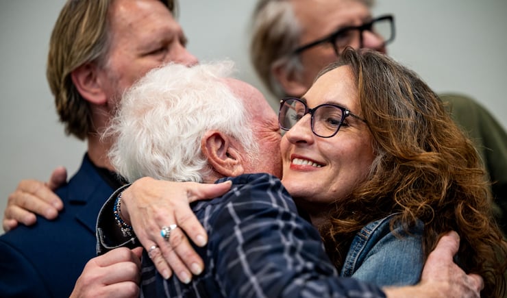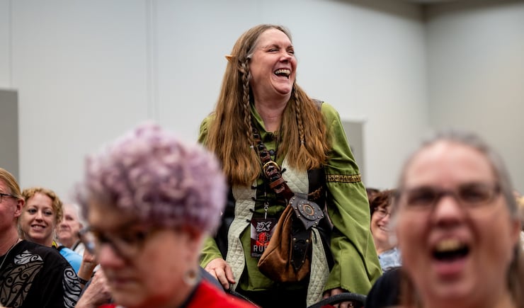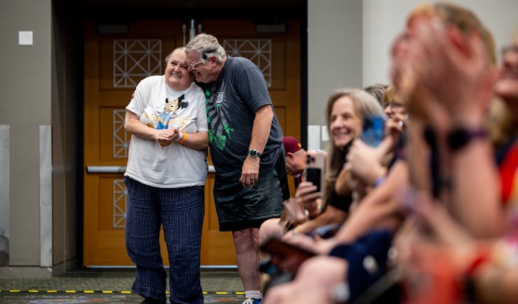 Stephanie Goodman, from Orem, right, hugs Donny Most, left, after a “Happy Days” panel discussion at FanX Salt Lake Pop Culture and Comic Convention at the Salt Palace Convention Center in Salt Lake City on Thursday, Sept. 25, 2025. | Tess Crowley, Deseret News ‘Jump the shark’