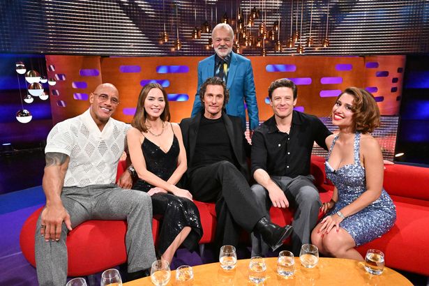 Dwayne Johnson, Emily Blunt, Matthew McConaughey, James Norton and Raye with host Graham Norton during filming for the Graham Norton Show, at BBC Studioworks 6 Television Centre, Wood Lane, London, to be aired on BBC One on Friday evening