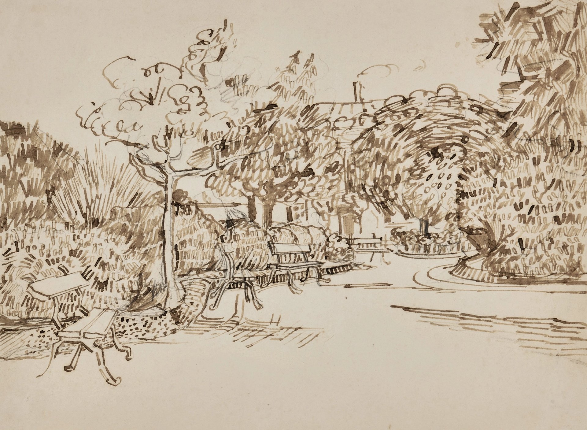 Public Garden with Benches was sent to Theo, probably on the very day that Van Gogh signed the lease for the Yellow House, on 1 May 1888. Devoid of people, the sketch includes four benches, but is dominated by the trees and bushes.