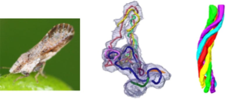 The Asian citrus psyllid (left), a representative elongated Profftella cell containing numerous intracellular tubules (middle), and the architecture of a single tubular structure (right). Credit: Toyohashi University of Technology