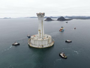 Fig. 2. Pictured during its initial tow-out in June from the assembly yard at the Port of Argentia, the West White Rose platform base and related projects are supporting hundreds of upstream jobs in Newfoundland and Labrador. Image: Allseas.