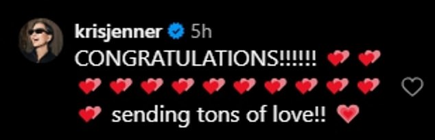 Kim Kardashian also included swirling heart emojis while her mother Kris Jenner typed, ‘CONGRATULATIONS!!!!!! sending tons of love!!’ with more heart emojis.