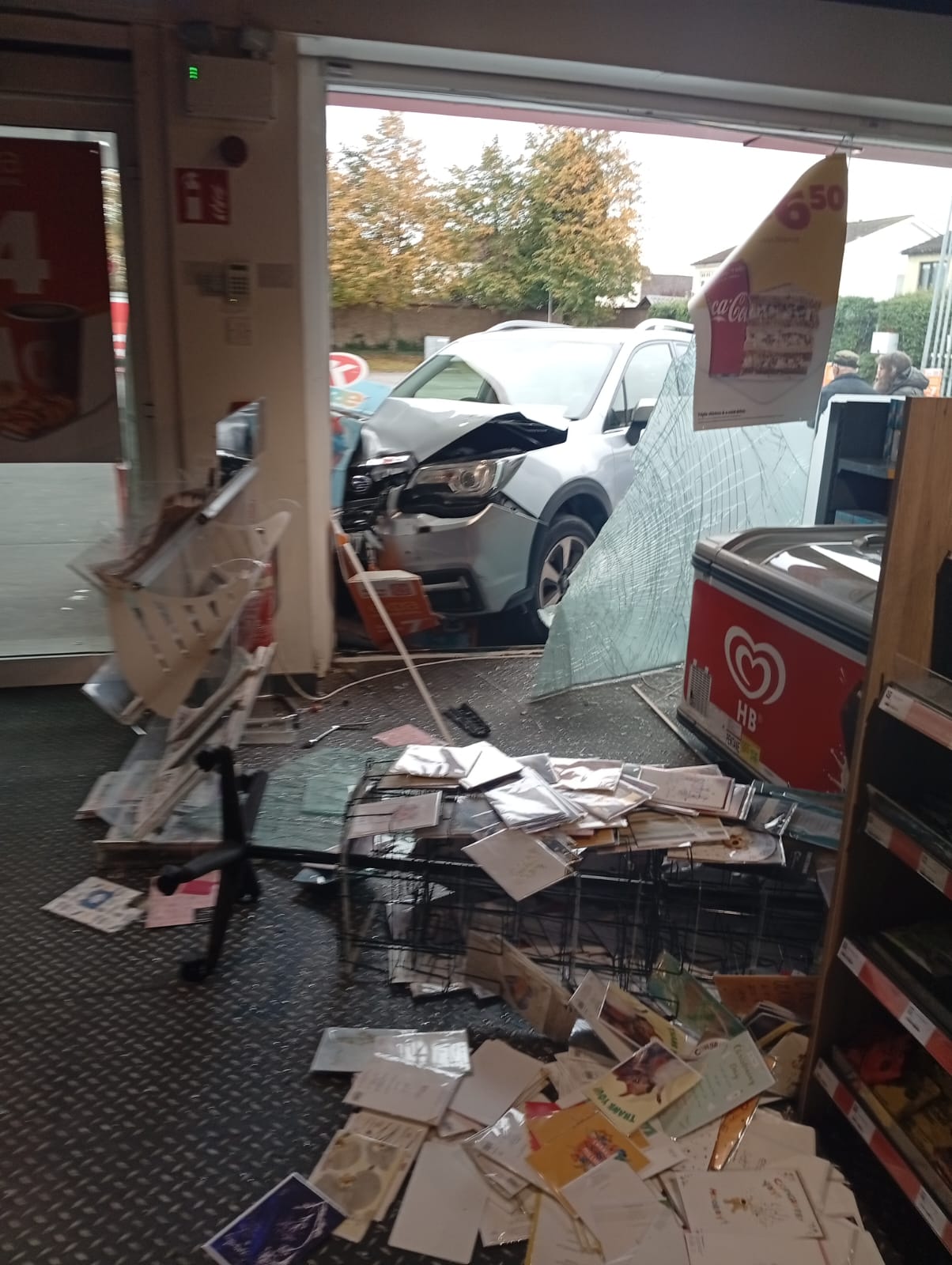 The front of the store, adjacent to the door, has suffered significant damage. It is not known how the collision occurred.