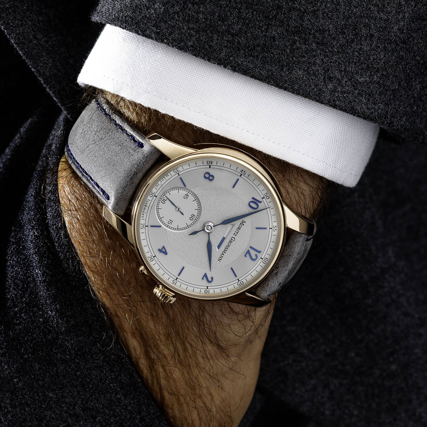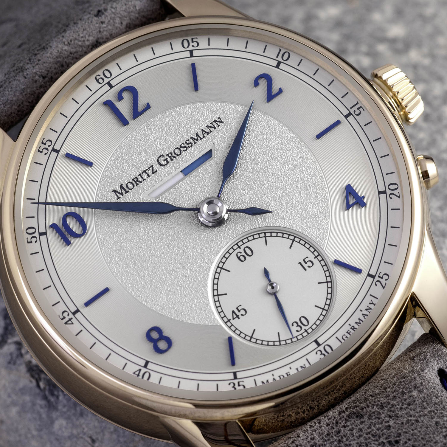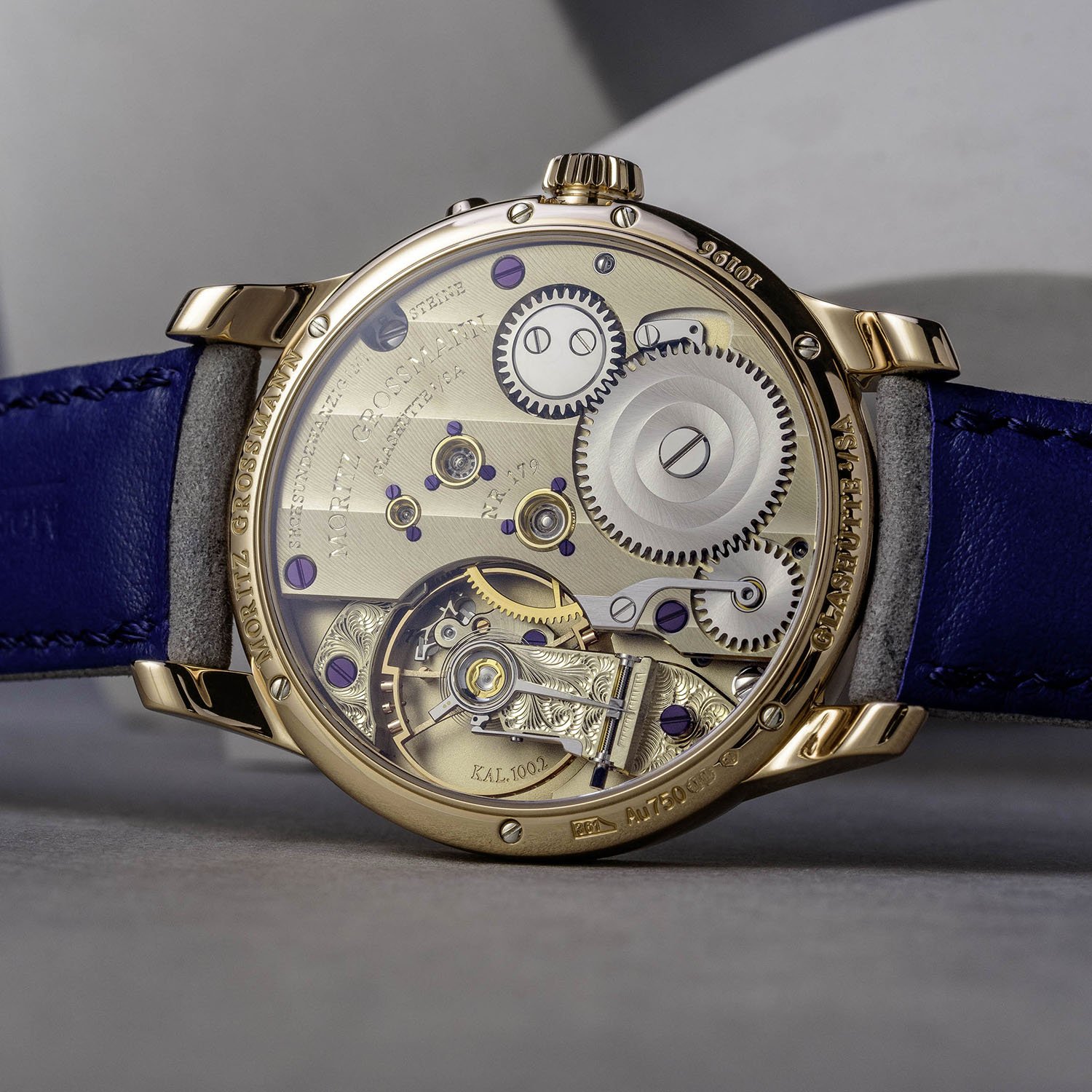 The watches are paired with a soft grey Kudu leather strap with blue stitching to match the blue elements on the dial. The retail price is EUR 53,300. More information at grossmann-uhren.com.