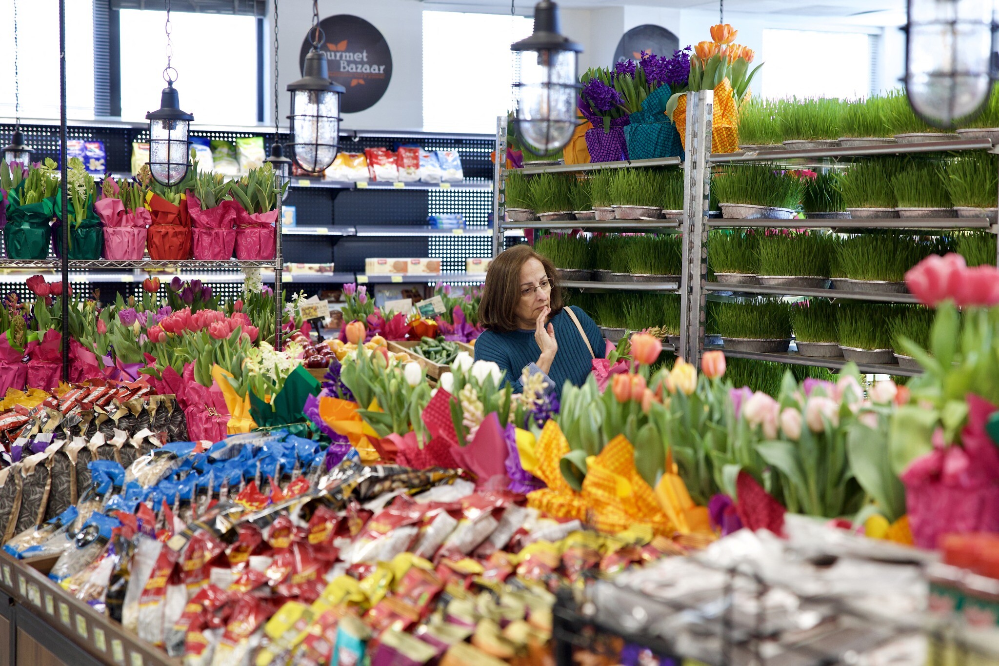 A woman shops as Sabzeh, a type of wheat grass that is a key item for Nowruz Haft-Sin tables, and flowers are displayed at Gourmet Bazaar in Rockville, Maryland, on March 18, 2026, ahead of Nowruz, the Persian New Year. (Amid Farahi/AFP)